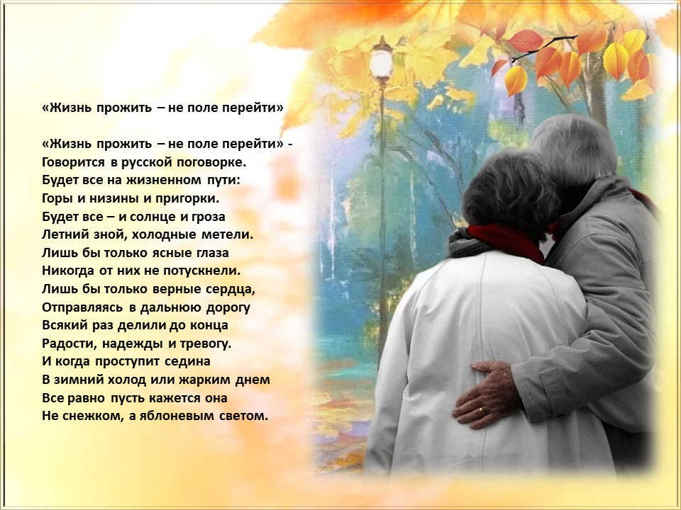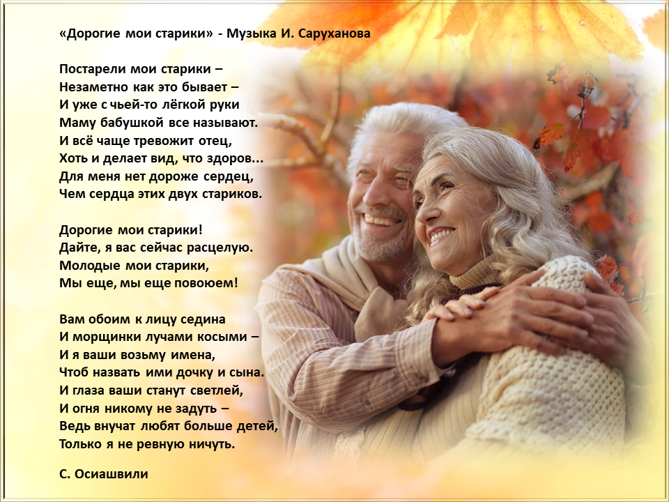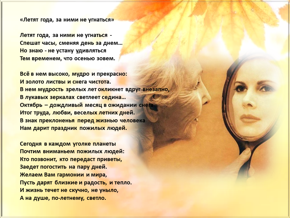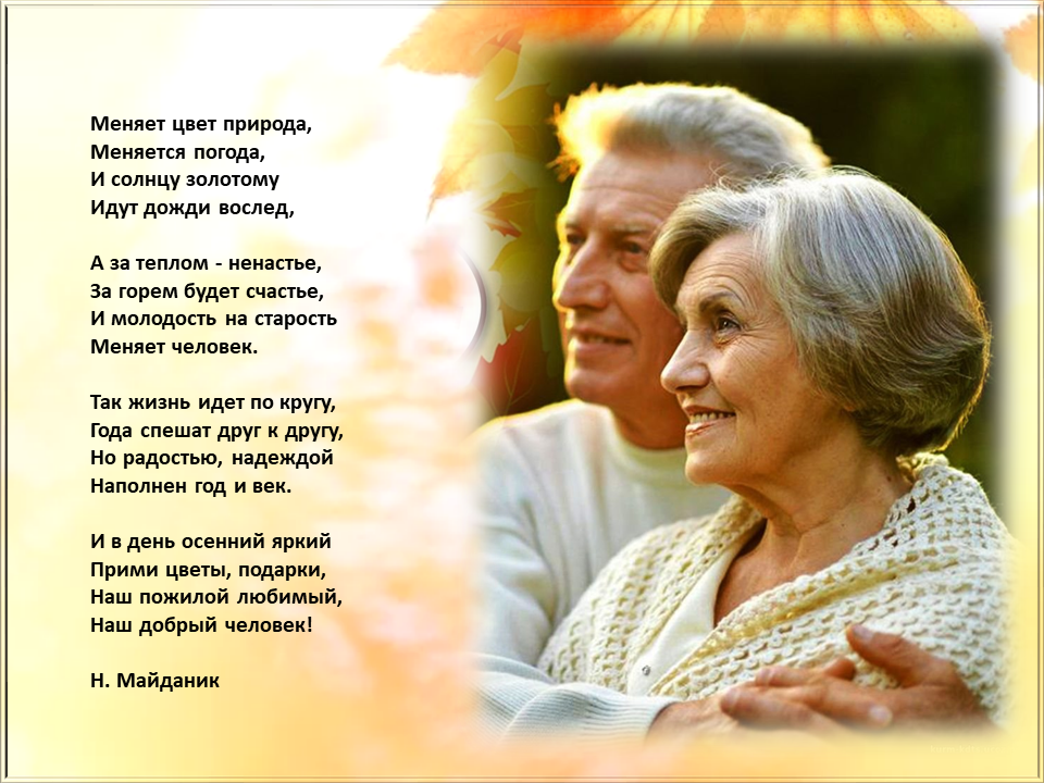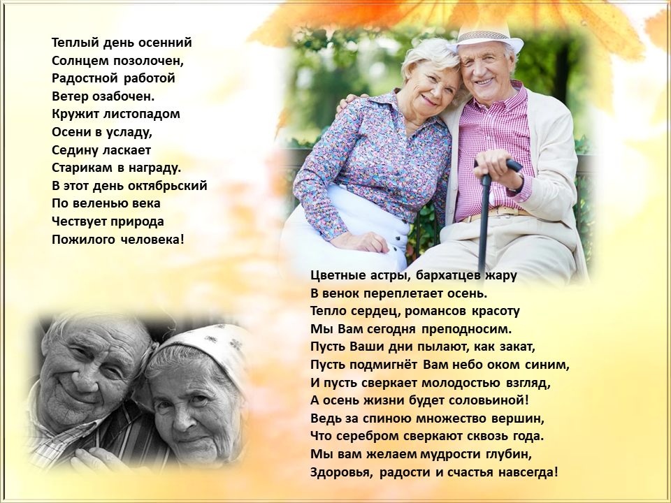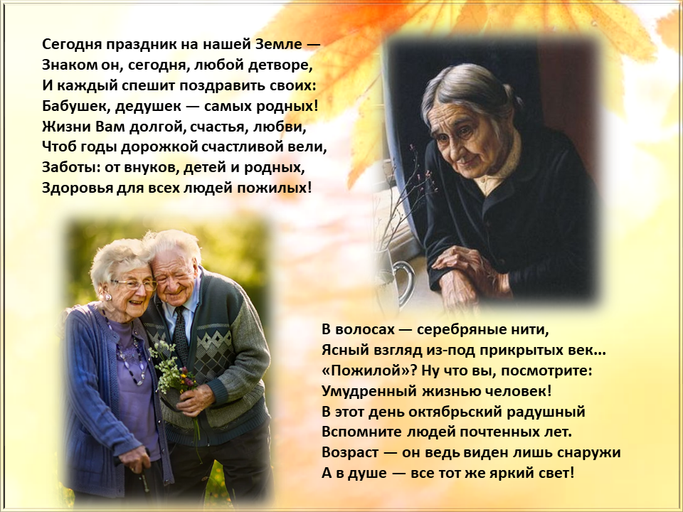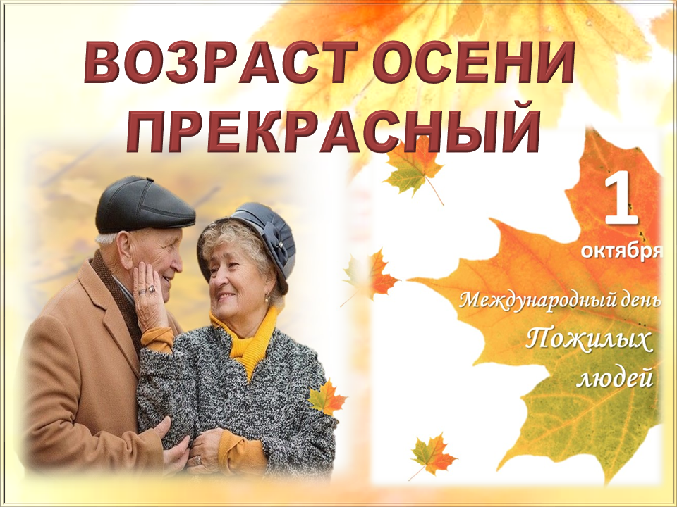 1 октября — Международный день пожилых людей, ежегодно, в золотую осеннюю пору мы чествуем тех, кого мы уважаем и любим. Второе название этого дня – день добра и уважения. Этот день даёт прекрасную возможность выразить глубокое уважение и сказать теплые слова благодарности всем пожилым людям за их добросовестный труд, за их огромный жизненный опыт, за доброту и мудрость. День пожилого человека это добрый и светлый праздник, в который мы окружаем особым вниманием наших родителей, бабушек и дедушек. Этот праздник очень важен сегодня, т. к. он позволяет привлечь внимание к многочисленным проблемам пожилых людей, существующим в современном обществе. Этот праздник имеет международный статус. Не просто так было принято отмечать этот праздник осенью, ведь старость считается – золотой порой, как и осень.