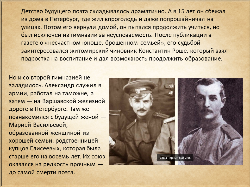 В 1880 году, в Одессе, в семье Менделя Давидовича и Марьем Мееровны Гликберг родился сын Александр, спустя многие годы ставший известным прозаиком, поэтом и мастером лирико-сатирического фельетона. Он творил под псевдонимом Саша Черный. И все его поклонники знали поэта-сатирика именно под этим именем. Хотя, на самом деле, после крещения его звали Александр Михайлович Гликберг.