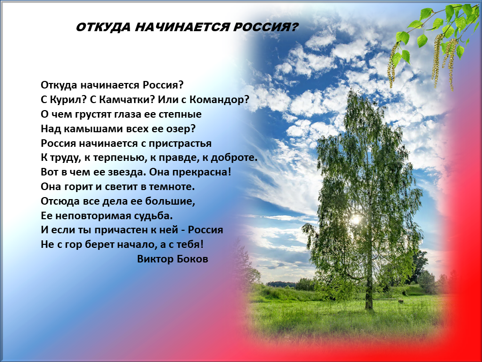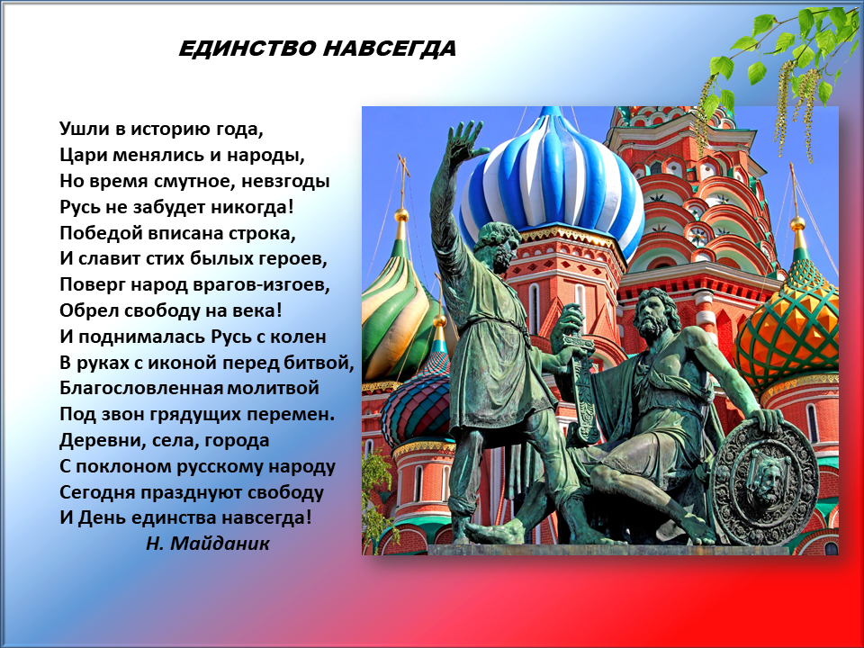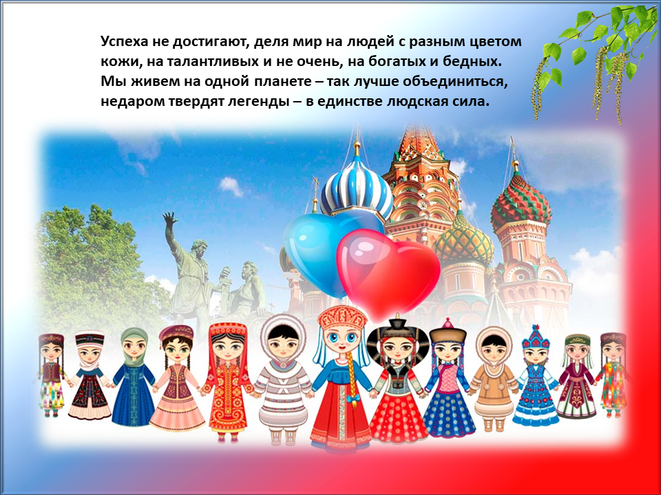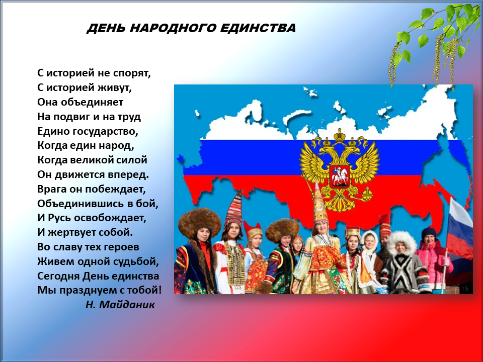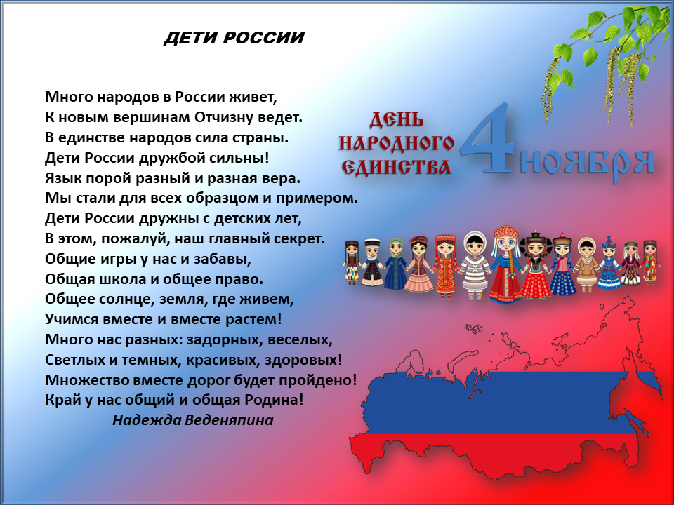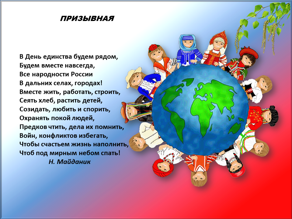 С 2005 года 4 ноября в России отмечается праздник — День народного единства, который посвящен Родине и дружбе между народами. У каждого народа есть своя малая Родина. В России живут народы разных национальностей, и все они дружат между собой. У каждого народа есть свои обычаи, традиции, песни, танцы, но все они связаны тем, что у них одна Родина – Россия.
