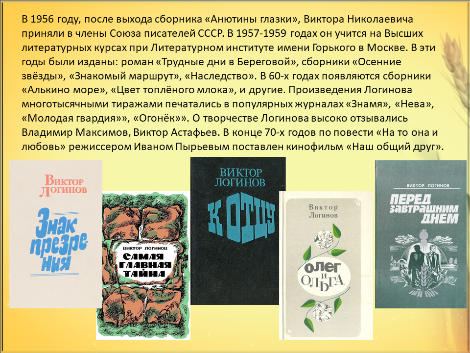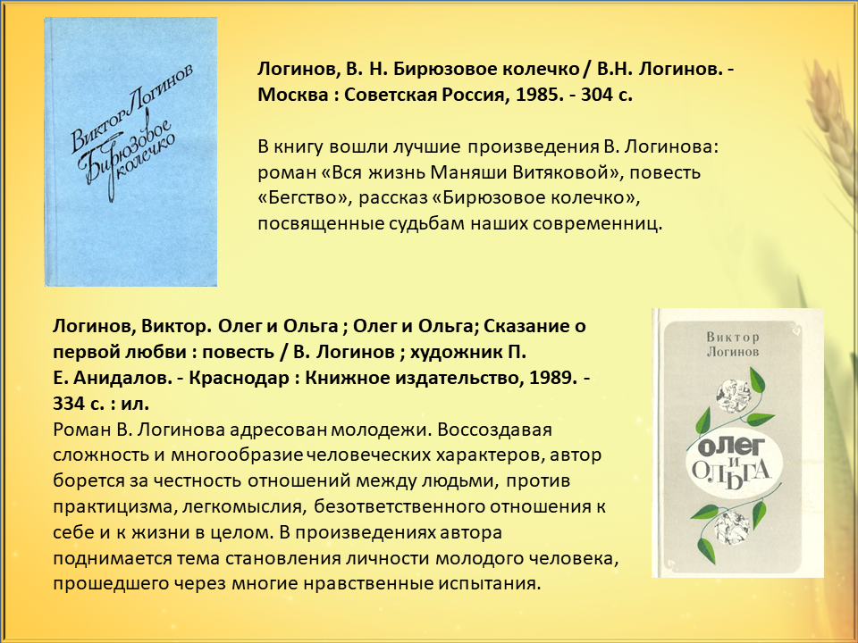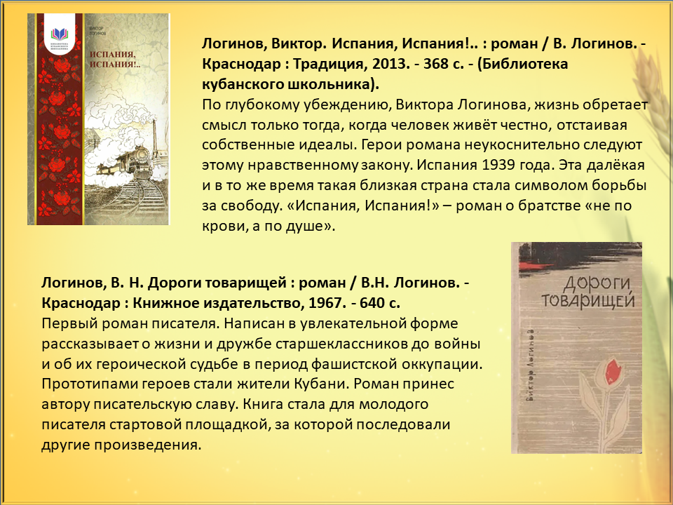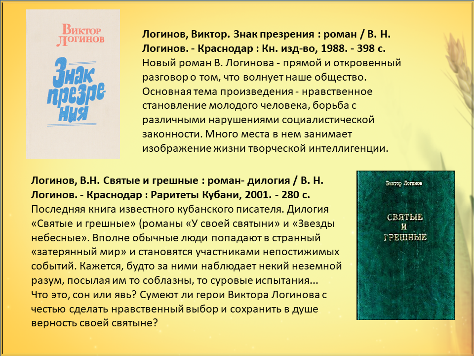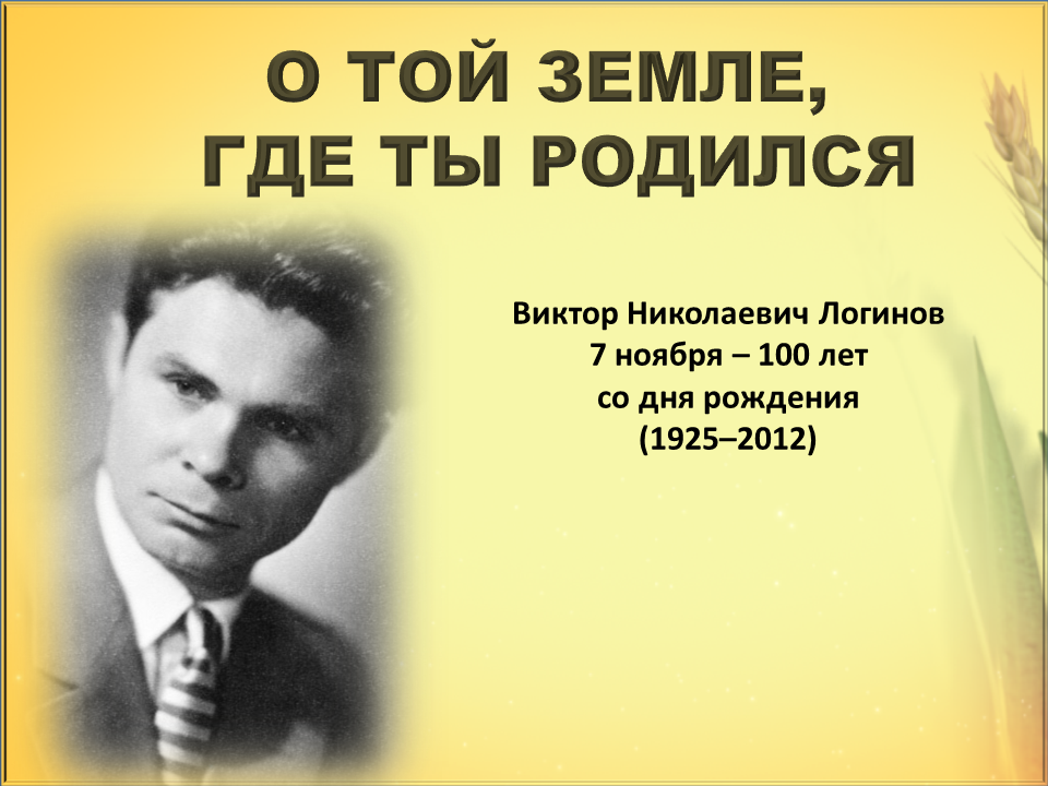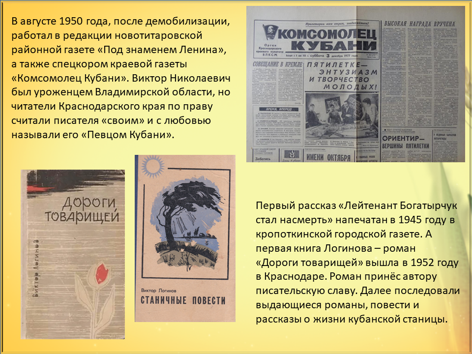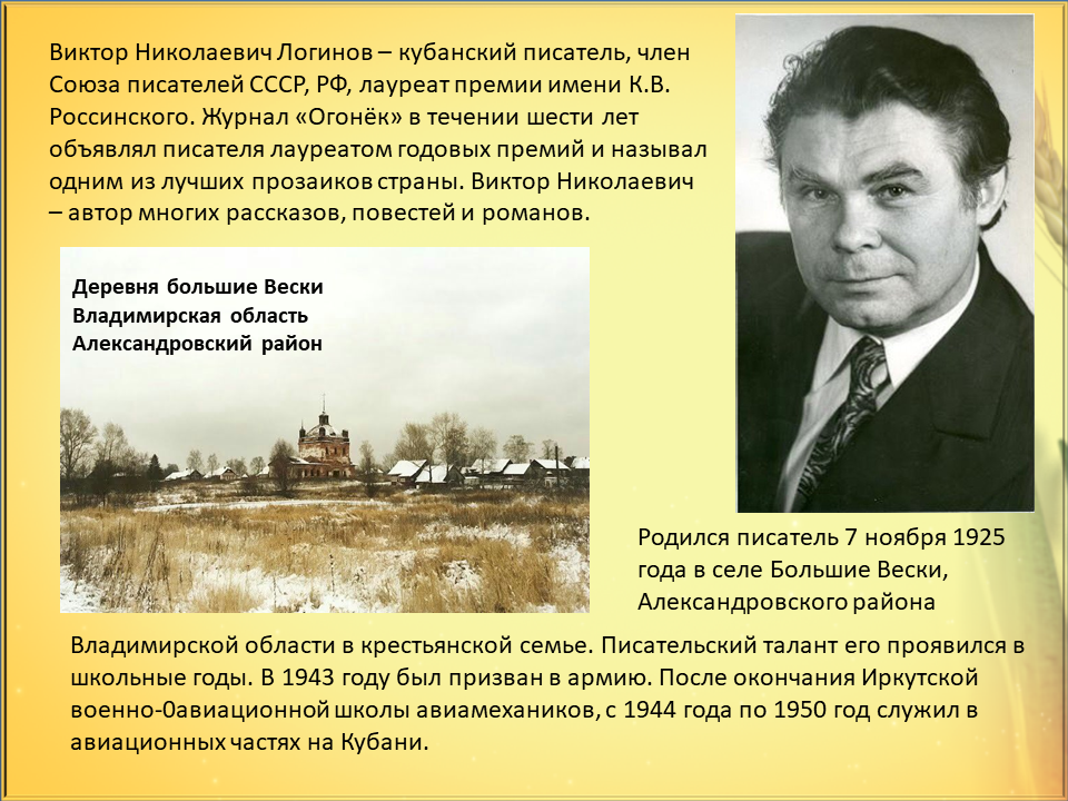 07 ноября – 100 лет со дня рождения Виктора Николаевича Логинова, Кубанского писателя, чьё творчество прочно связано с Кубанью и стало важной частью её культурного наследия. Виктор Логинов – член Союза писателей СССР-России, заслуженный работник культуры Кубани, лауреат премии им. Россинского, лауреат муниципальной премии им. Знаменского, кавалер орденов «Знак почета» и «Дружба народов», обладатель Почетной грамоты Президиума Верховного Совета РСФСР и многих других литературных и государственных наград.