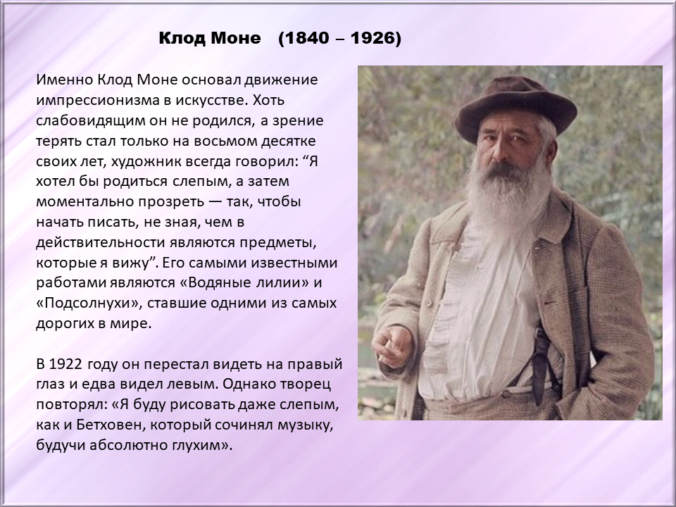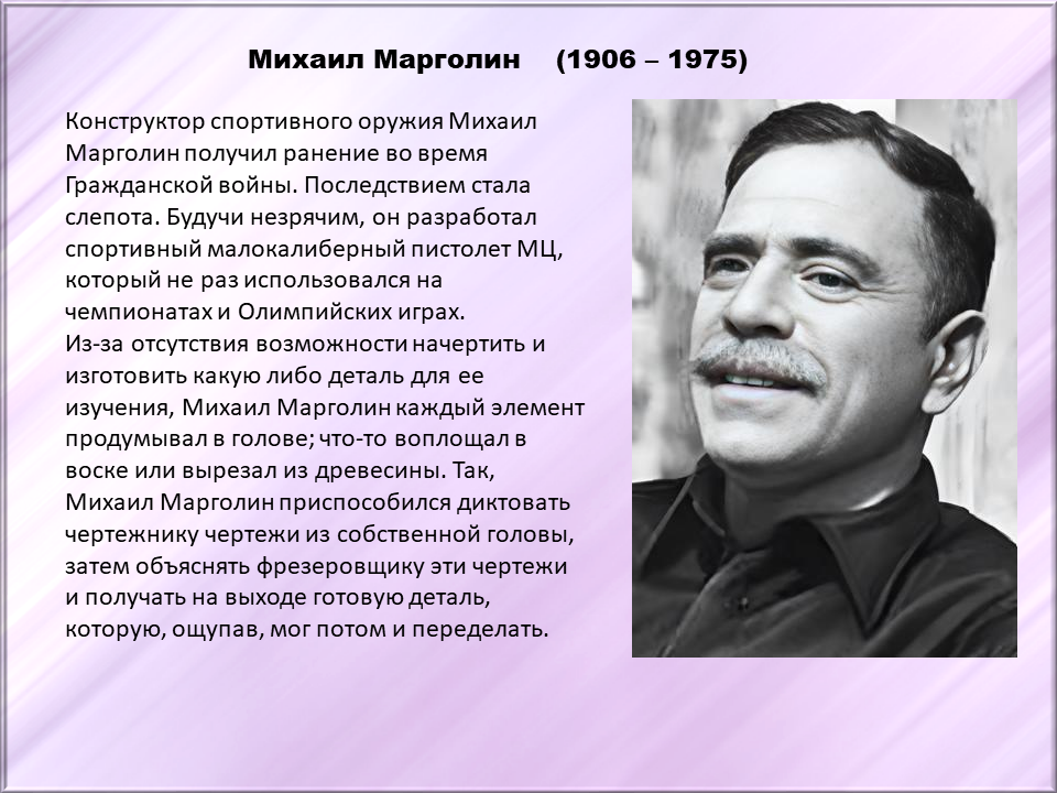 Их физические особенности не стали препятствием для поиска себя, борьбы за те человеческие ценности, которыми мы по праву гордимся. Зрячим людям трудно представить себе жизнь слепого, те ежедневные сложности, с которыми он сталкивается в быту, – трудно самому налить воды, приготовить еду, сходить в магазин. Когда зрячий человек завязывает себе глаза, чтобы «побывать в шкуре» слепого, оказывается, что он не может почти ничего. Тем более восхищает опыт тех, кого полная слепота или совсем небольшой процент зрения не только не сломила, но сделала сильными и успешными.
