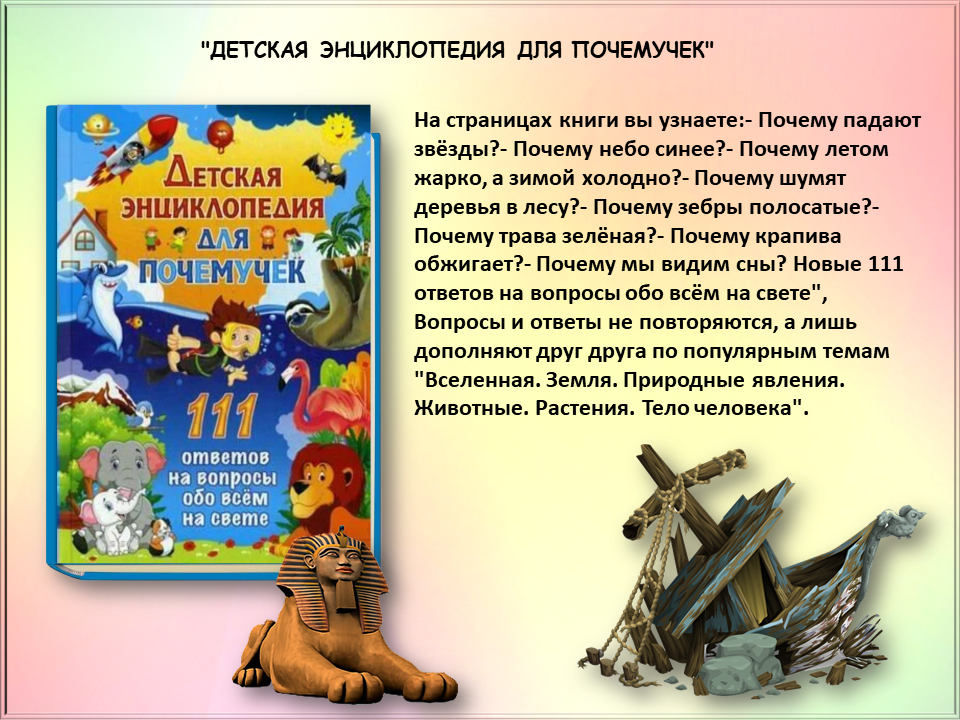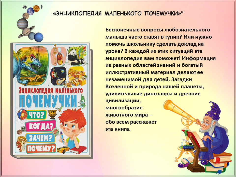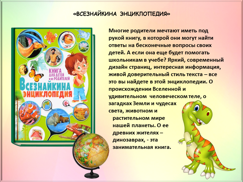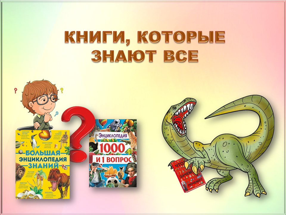 Познавая окружающий мир, у вас возникает множество вопросов: «Откуда? Зачем? Почему?». Все эти вопросы вы задаете старшим. Но бывает и так, что они не всегда могут вам ответить. Человек не может знать обо всём на свете, хранить в памяти множество различных сведений: названия, имена, цифры и факты. В этом Вам могут помочь книги, которые знают всё. Это справочная литература — энциклопедии, словари и справочники. В них вы можете найти ответы на самые разнообразные вопросы, они знакомят вас с достижениями науки и техники, с биографиями выдающихся ученых, полководцев, путешественников, историей научных открытий и изобретений, явлениями природы. Эти книги, можно начинать читать с любого места, даже с конца, в них можно только заглянуть, чтобы узнать значение того или иного слова, или узнать, как оно звучит и пишется на иностранном языке, а можно прочитать и небольшой рассказ о каком-то историческом событии, городе или знаменитом человеке.