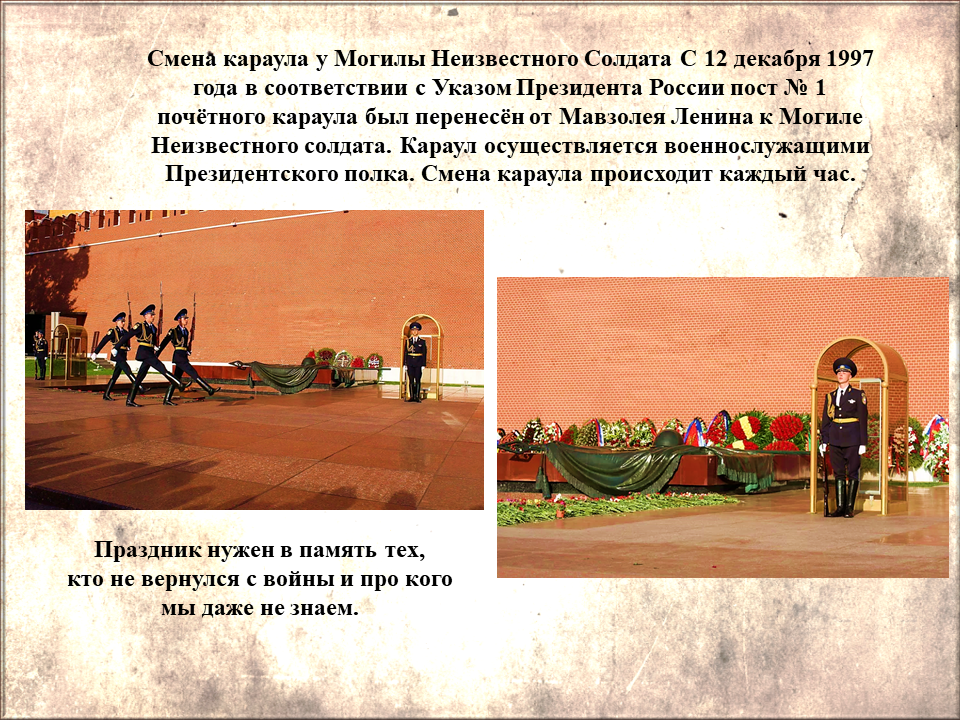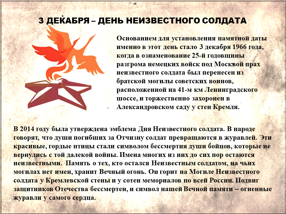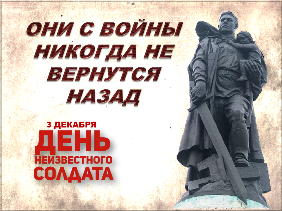 С 2014 года, в соответствии с Указом Президента РФ Владимира Путина «О днях воинской славы» 3 декабря стали отмечать День Неизвестного солдата в память о российских и советских воинах, погибших в боевых действиях на территории нашей страны или за её пределами, чьё имя осталось неизвестным. Пропасть без вести – не значит раствориться во тьме истории, поэтому безымянные герои живы в сердцах людей. Память о каждом солдате, защищавшем нашу Родину, священна. День Неизвестного солдата – это наш общий земной поклон людям, которые ценой своей жизни сберегли Россию, это дань благодарности всем тем, кто погиб на фронтах и чьи могилы не могут навестить их родственники и потомки, но куда всегда будут приходить нынешнее и будущие поколения россиян. Ежегодно в этот день чтят память героев, отдавших свои жизни во имя победы. Жители российских городов возлагают цветы к братским могилам, памятникам и мемориалам, в Москве проходит церемония возложения цветов к Могиле Неизвестного Солдата в Александровском саду.