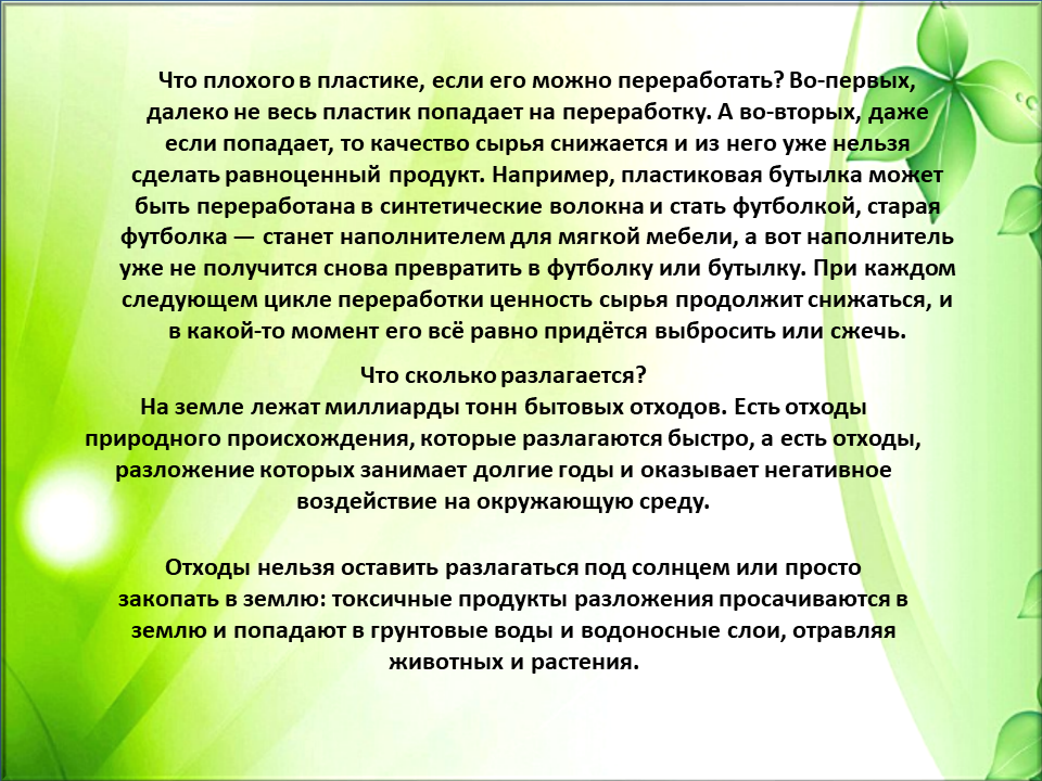 Охрана окружающей природной среды — это важная глобальная проблема и особого внимания заслуживает проблема утилизации бытовых отходов. Загрязнение и отходы – это все то, что не может быть усвоено природой и не может стать частью её круговоротов.