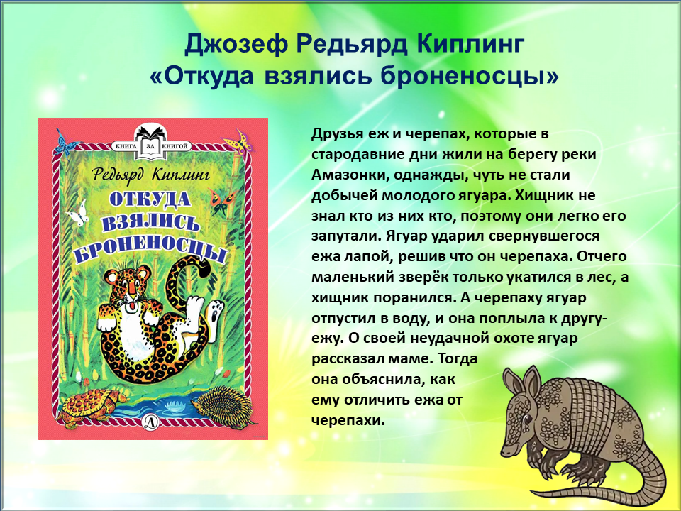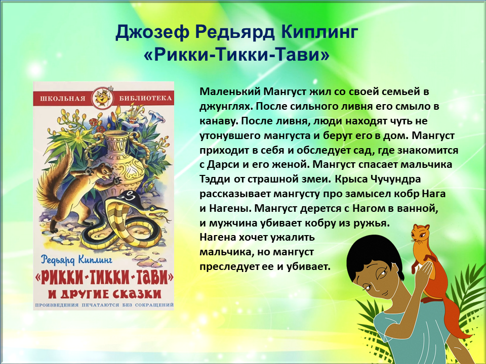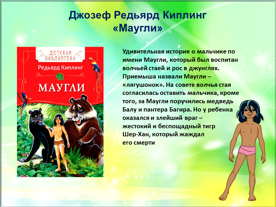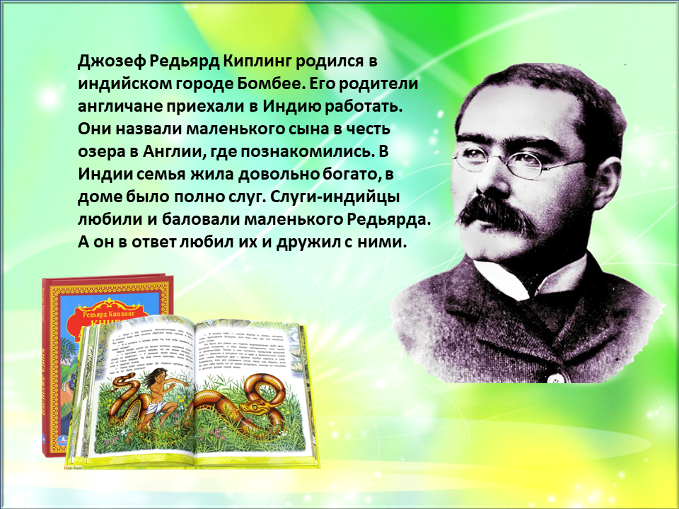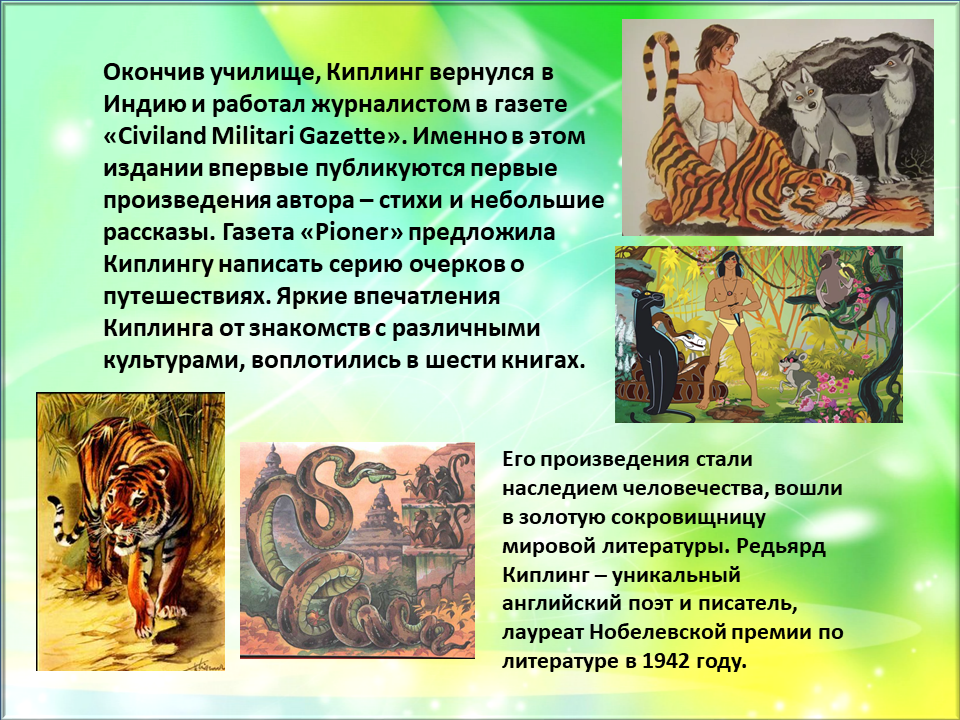 Киплинг писал книги для взрослых и для детей. Для самых маленьких он сочинял сказки, для детей постарше – рассказы. Самые интересные из них – это рассказы о животных, из которых составились два сборника знаменитой «Книги джунглей». Автора этих книг, считают сейчас детским писателем. Хотя сам Р. Киплинг свои книги вовсе не считал детскими, и определение «детский писатель» обидело бы его… Когда Киплинг окончил школу, он твердо знал, кем хочет стать в жизни, — писателем… Он удивительный писатель-анималист. Животные у него думают, разговаривают и поступают вполне по-человечески, потому что Киплинг наделил их добродетелями и пороками, присущими человеку. Но вместе с тем звери у Киплинга совершенно узнаваемы как животные, потому что писатель сумел подметить в каждом его зоологические признаки. Киплинг первый в мире англичанин, который получил Нобелевскую премию в области литературы в 1907 году.