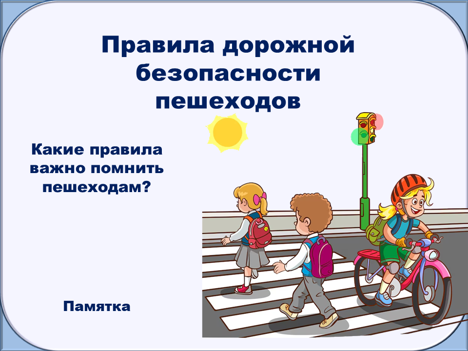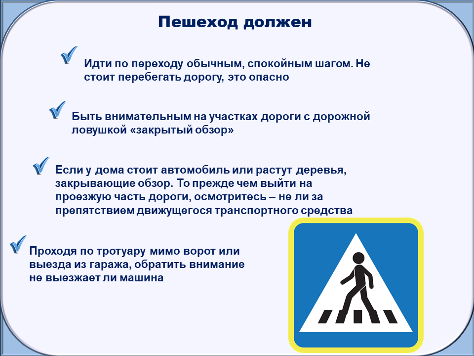 Правила дорожной безопасности пешеходов включают требования к движению, переходу дороги, ожиданию транспорта и поведению в тёмное время суток. Эти правила определены в Правилах дорожного движения.