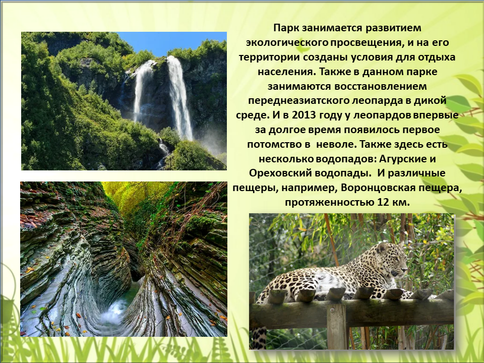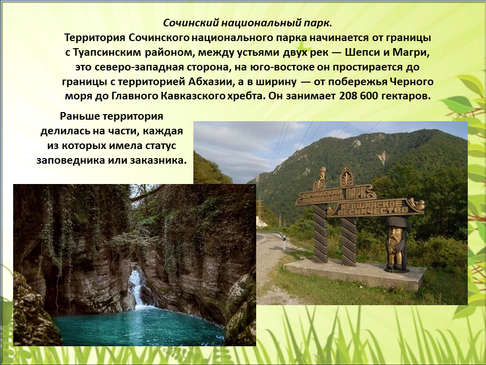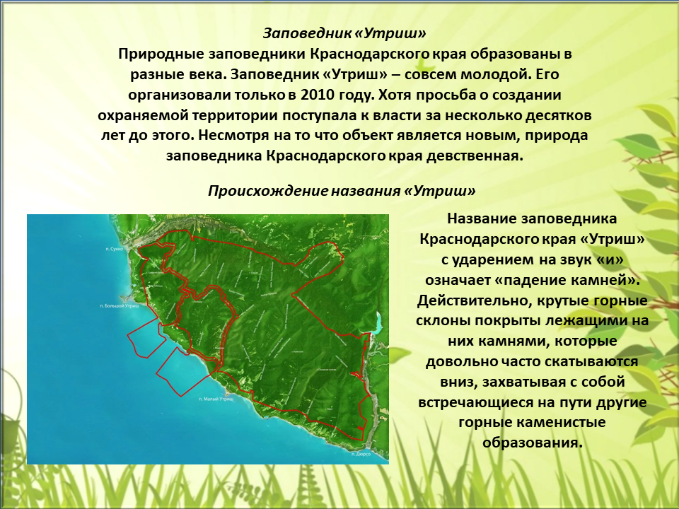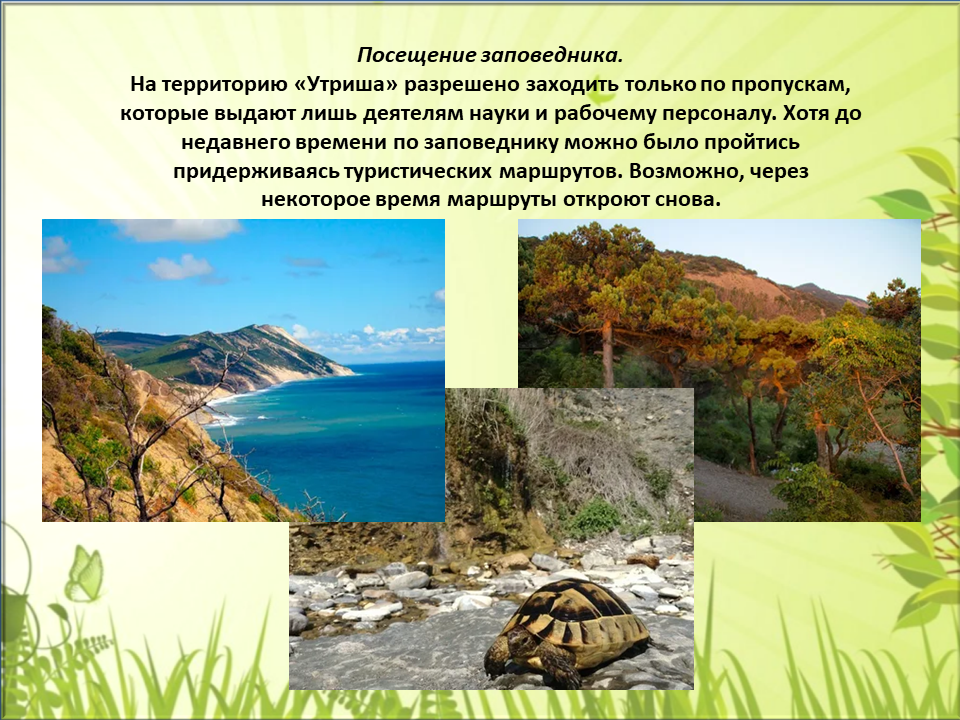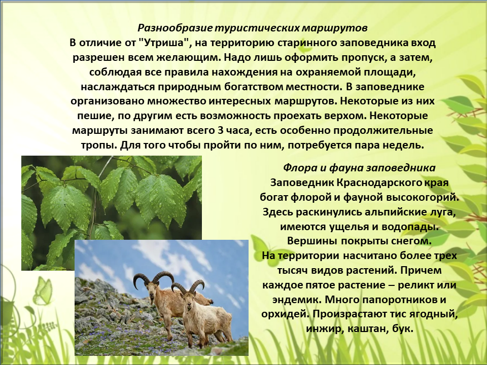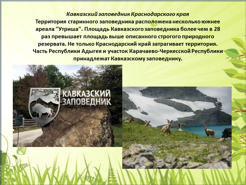 В целом природа богата и необычна, и именно поэтому на территории Краснодарского края расположены три заповедника: Кавказский заповедник, Сочинский национальный парк, Заповедник Утриш.
