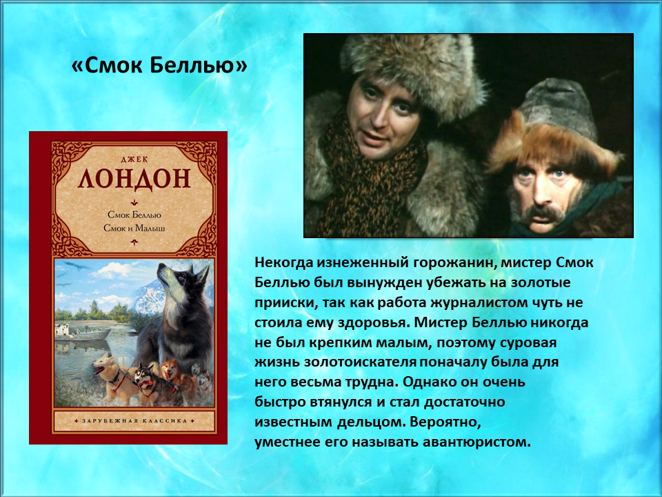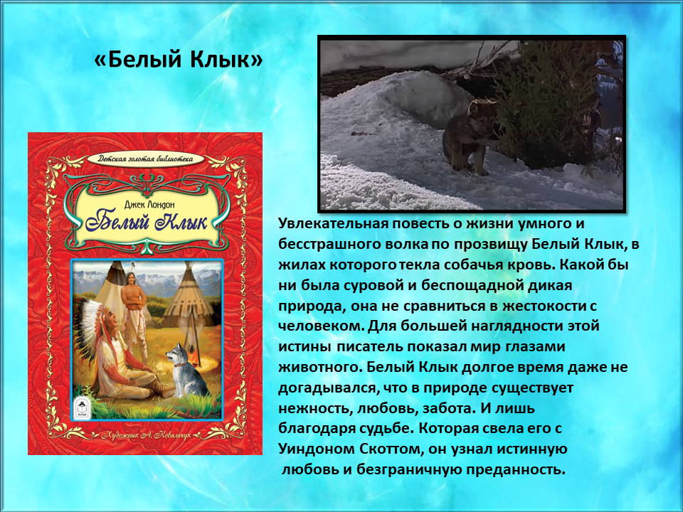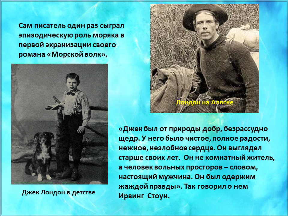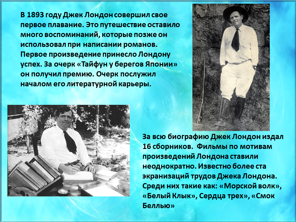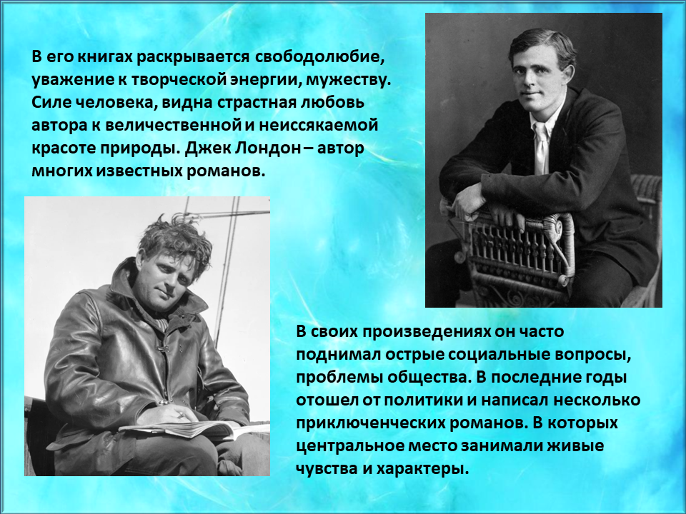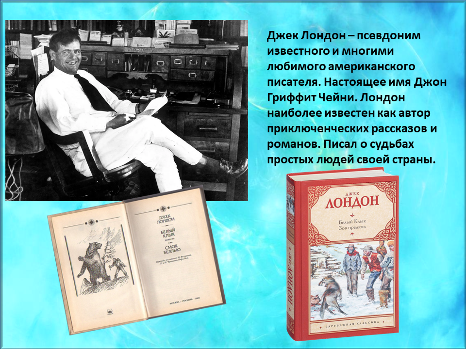Джек Лондон был самым успешным писателем Америки начала 20 века, чья жизнь символизировала силу воли. Семья Джека Лондона была очень бедна, поэтому он начал работать в возрасте 8 лет. Он продавал газеты, работал на кораблях и фабриках. Джек путешествовал через океан как моряк, шел пешком из Сан-Франциско в Нью-Йорк с армией безработных и назад через Канаду в Ванкувер. Он много путешествовал, совершил морские путешествия, и ему хотелось рассказывать о своих приключениях. Но когда он попытался писать, то понял, что язык его беден, в речи его много ошибок, потому что он не знает грамматики. Будучи взрослым парнем, пошел в школу. Он много впитывал от учителей, учеников, но больше всего он узнавал много нового из книг. Он прочел все книги в школьной библиотеке и, читая известных авторов, старался открыть для себя секрет их искусства. Даже во времена золотой лихорадки на Аляске Джеку Лондону не удалось заработать себе на жизнь, и он вернулся к идее стать писателем. Писательская деятельность и публикации его рассказов заставили Джека Лондона упорядочить свою жизнь. В 27 лет его настигла слава благодаря роману Зов Природы. За последние 16 лет своей жизни, Джек Лондон опубликовал более 50 книг. Среди них популярная в нашей стране повесть «Белый Клык», о полусобаке полуволке, которая стала верным другом человека.