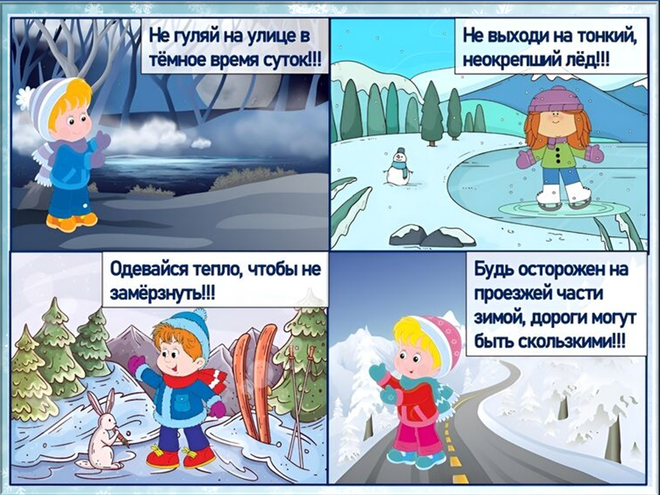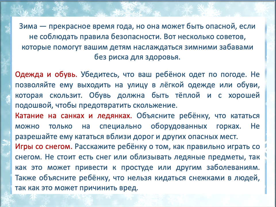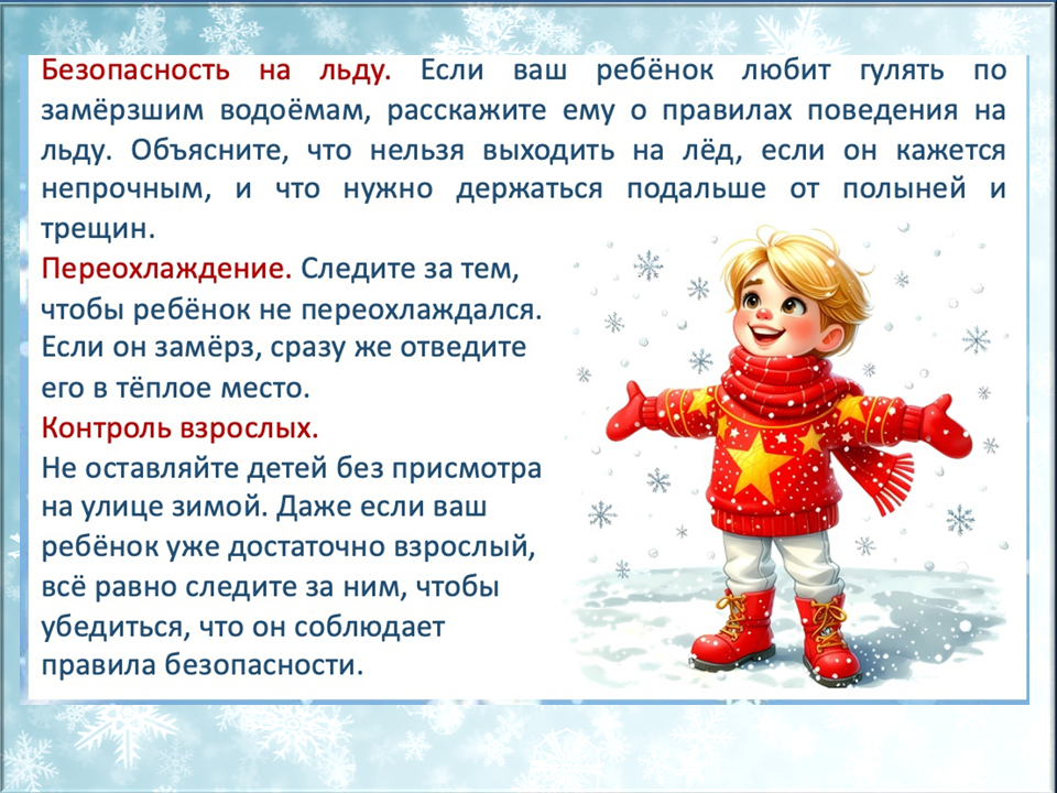Зимой для детей важно соблюдать правила безопасности в разных ситуациях: при прогулках, катании, нахождении вблизи водоёмов и обращении с огнём и пиротехникой. Важно заранее обсудить с ребёнком основные правила, чтобы предотвратить несчастные случаи.