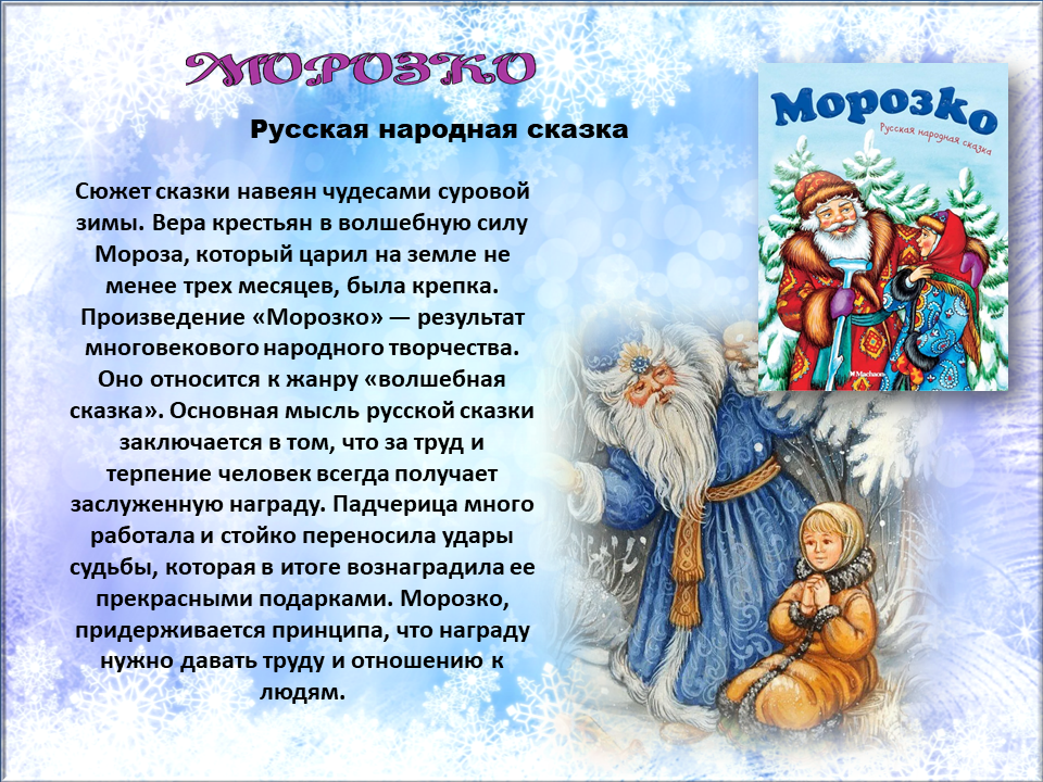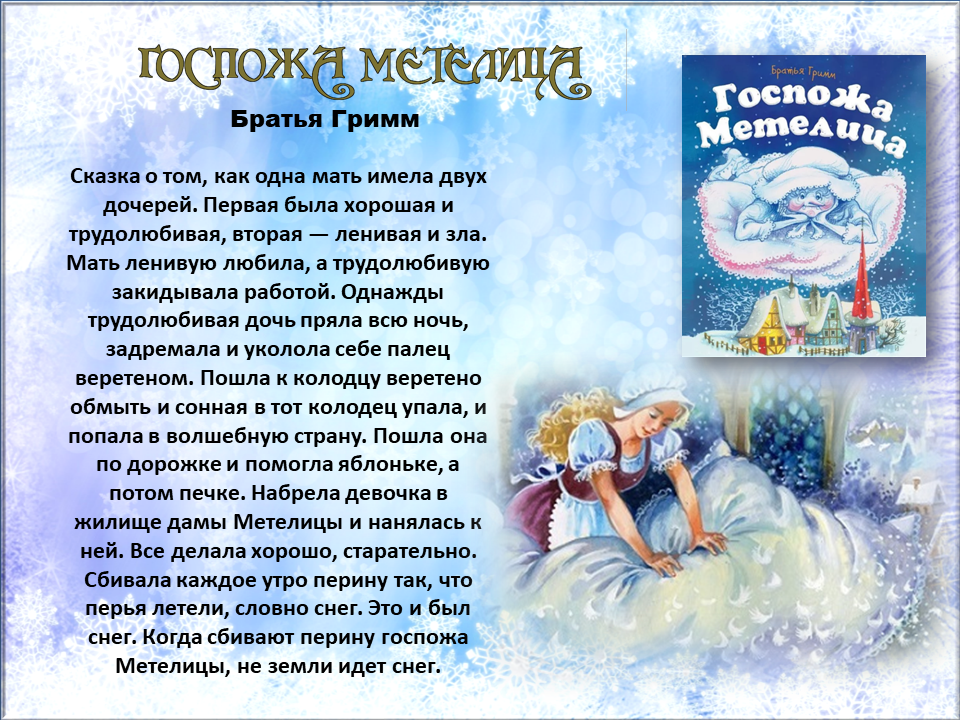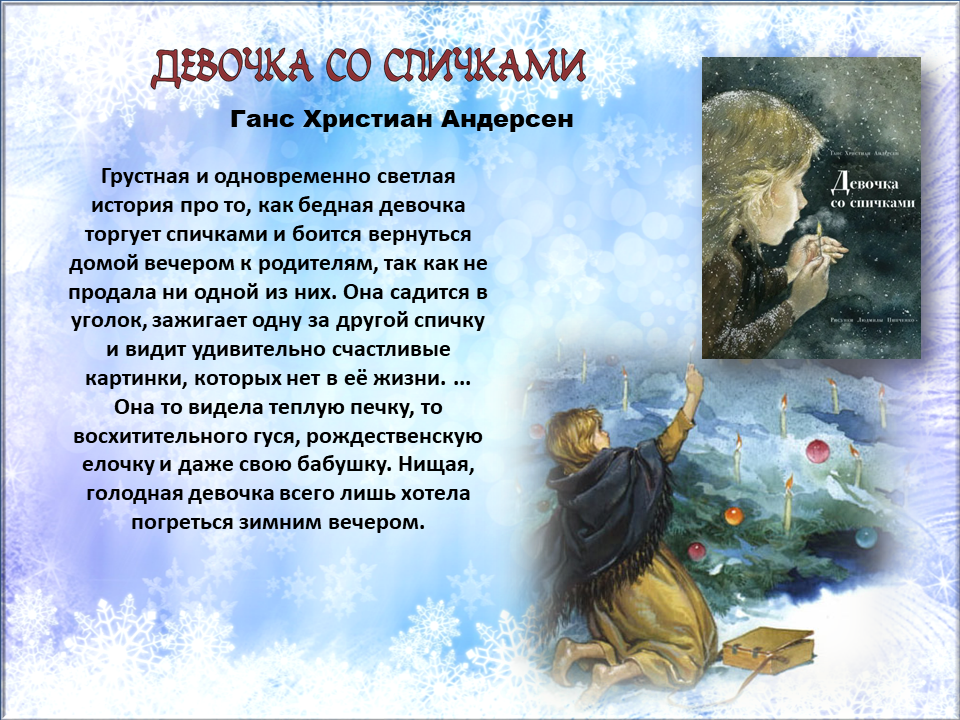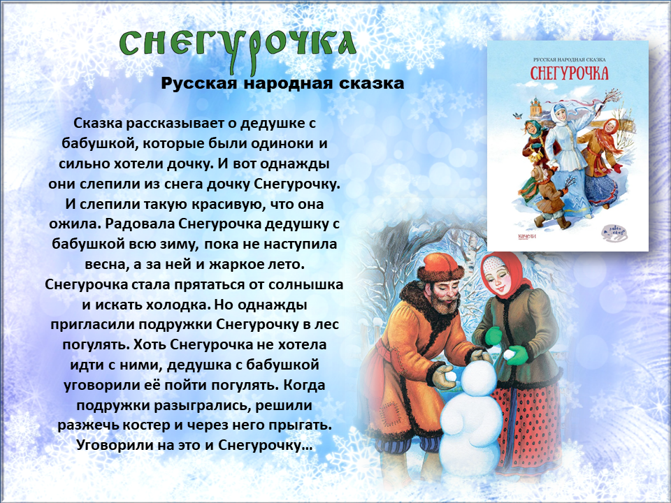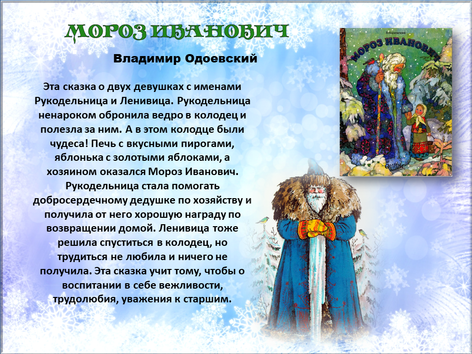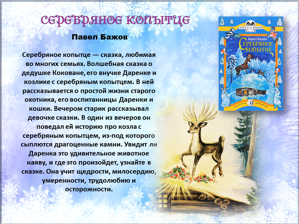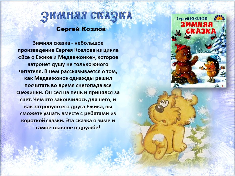 Зима – самое волшебное время года. И самое книжное. Время включить лампу под теплым абажуром, укутаться во что-нибудь теплое, и погрузиться в мир зимних сказок – таинственный и морозный. Сказки про зиму — фольклорные и произведения писателей, которые посвящены одновременно самому началу и концу года. В них говорится о пушистой, снежной и сказочной зиме, людях и зверях в этот период года. Зима приводит с собой самый любимый праздник года всех ребят — Новый год. Только зимой можно прокатиться на санках, коньках, лыжах, слепить снежные фигуры и построить ледовый дворец! Время волшебства и ожидание чуда. Сколько интересных приключений ожидает героев книг про зиму для детей, а вместе с ними и их читателей! Добрые, трогательные, забавные, а иногда грустные истории русских и зарубежных писателей, которые без сомнения понравятся детям и позволят взрослым окунуться в сказочную атмосферу. Длинные зимние вечера как будто предназначены для семейного чтения. Что может быть лучше интересной книги, когда за окном мороз, вьюга и холодный ветер. Зимние сказки наполнены незабываемыми приключениями, победами и чудесами.