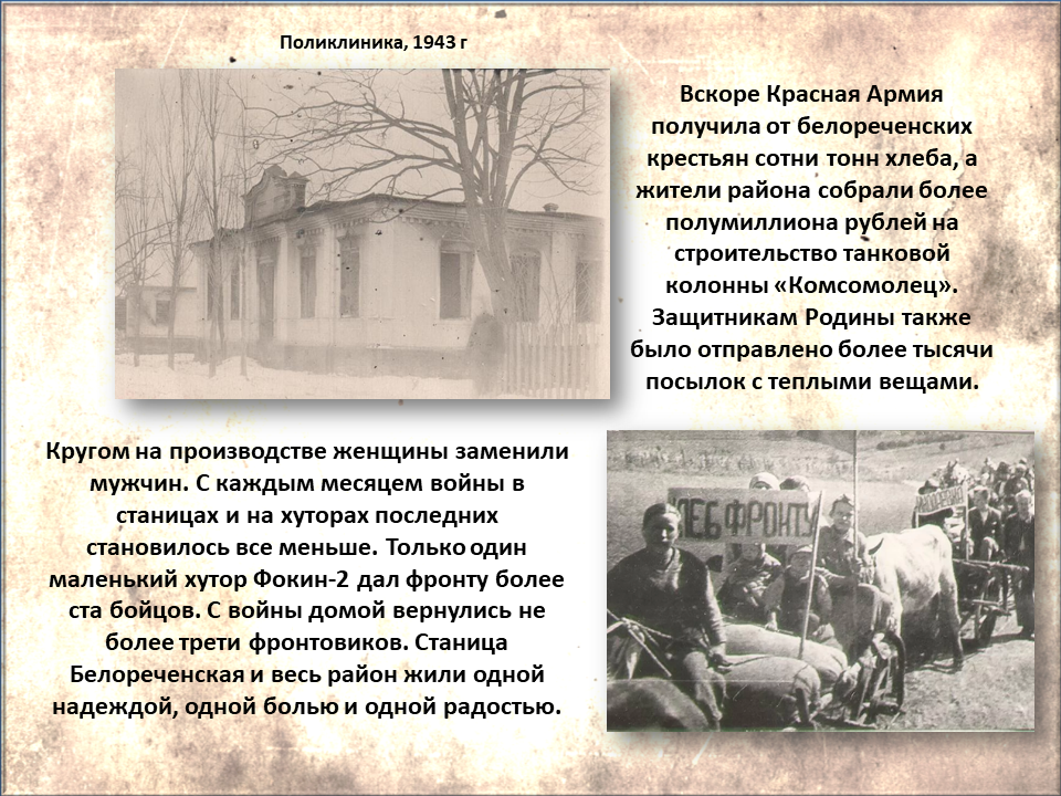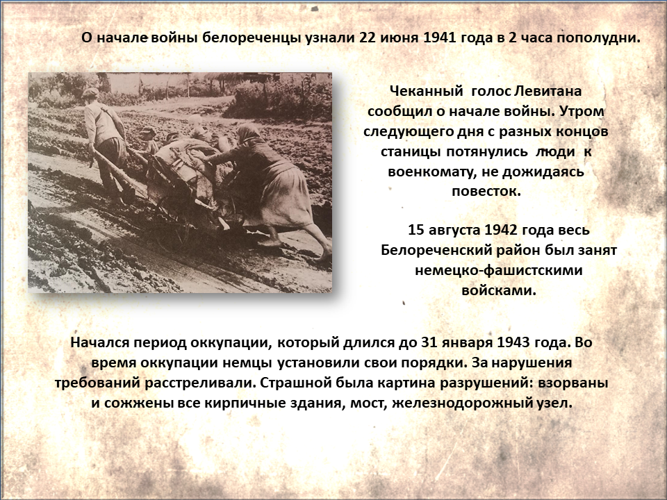 В конце января наш район отмечает знаковую дату – освобождение района от немецко-фашистских захватчиков. Оккупация продолжалась 6 месяцев: с 15 августа 1942 до 31 января 1943 года. Войну нельзя забывать. Хотя бы ради памяти тех, кто ценой тяжких страданий, мук даже собственной жизни даровал нам день сегодняшний. 22 июня 1941года регулярные войска германской армии, без объявления войны, напали на нашу страну. В 2 часа пополудни жители Белореченского района узнали о начале войны. Этот воскресный летний день выдался хмурым и ветреным. Чеканный, густой голос Левитана из черных новеньких репродукторов, появившихся в станицах за последний год, сообщил о том, что началась война. Наутро следующего дня, не дожидаясь повесток, потянулись цепочки добровольцев в районный военкомат из станиц, сёл и хуторов. Шли пешком, ехали на подводах. Для тех добровольцев, которым не исполнилось 18 лет, при военкомате сразу образовали курсы подготовки снайперов, шофёров, медицинских сестёр. Приказом № 3 от 1 июля 1941 года по Белореченскому гарнизону станица переводилась на военное положение.