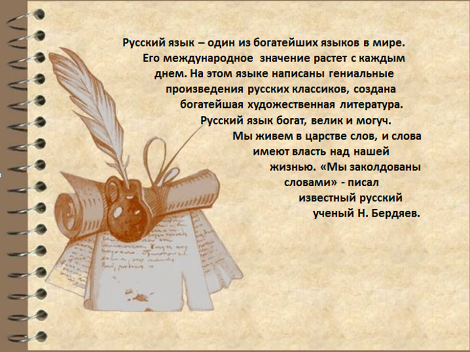 Мы не должны забывать, что Родной язык – это живая связь времён. С помощью языка человек осознаёт роль своего народа в прошлом и настоящем, приобщается к культурному наследию. В русском языке отразилась богатая и славная история русского народа: в нём оставили свой след и устное творчество, и великий труд русских писателей, и созидательный труд всего русского народа. Знать свой язык обязан каждый.