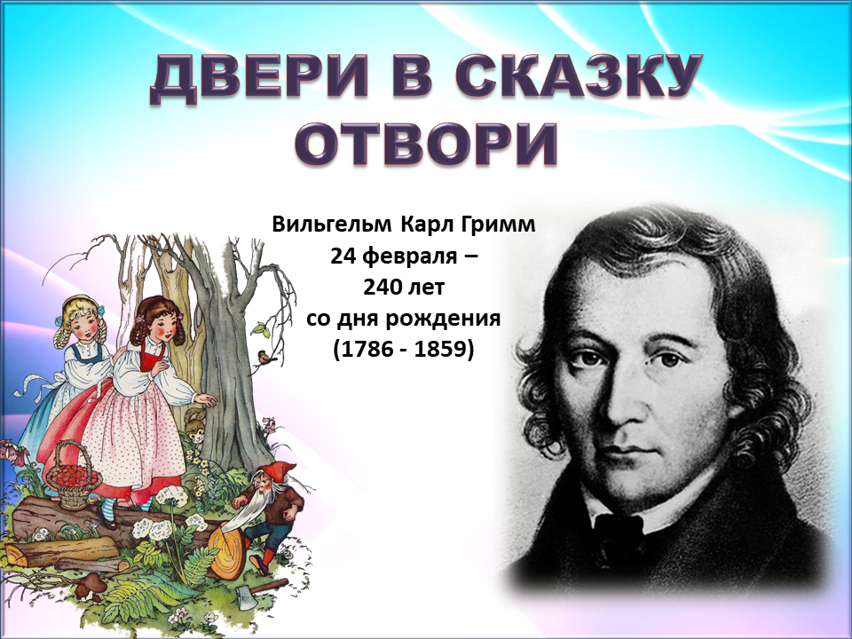 24 февраля – 240 лет со дня рождения немецкого филолога, фольклориста, одного из братьев-сказочников, Вильгельма Карла Гримма (1786–1859).