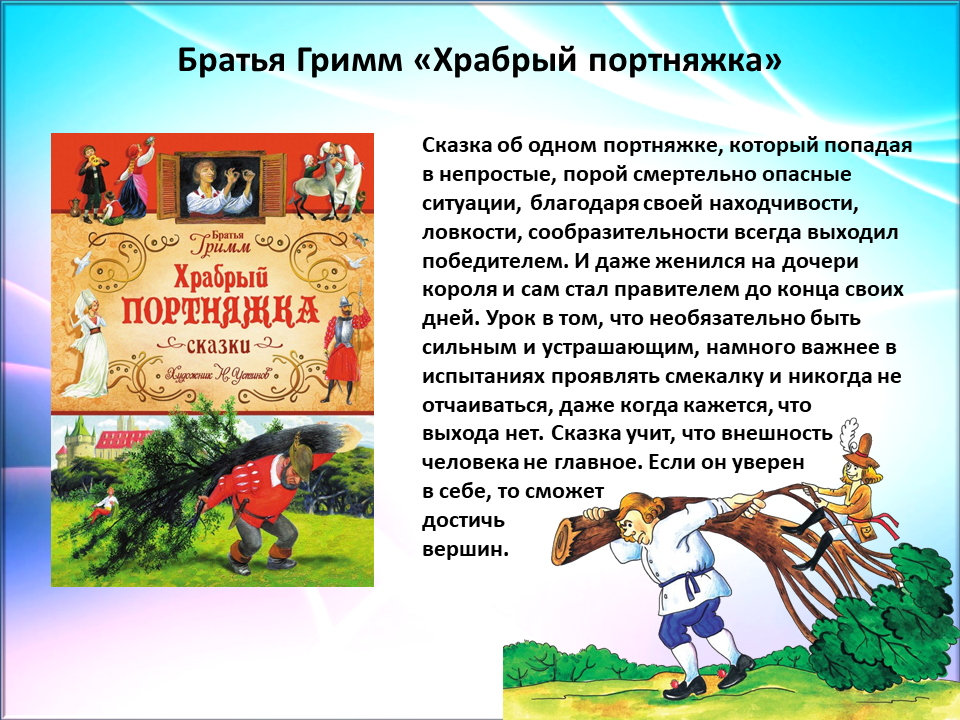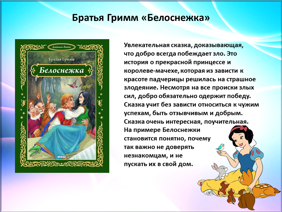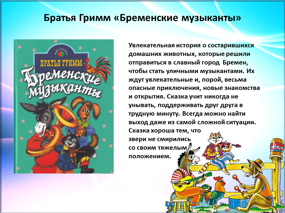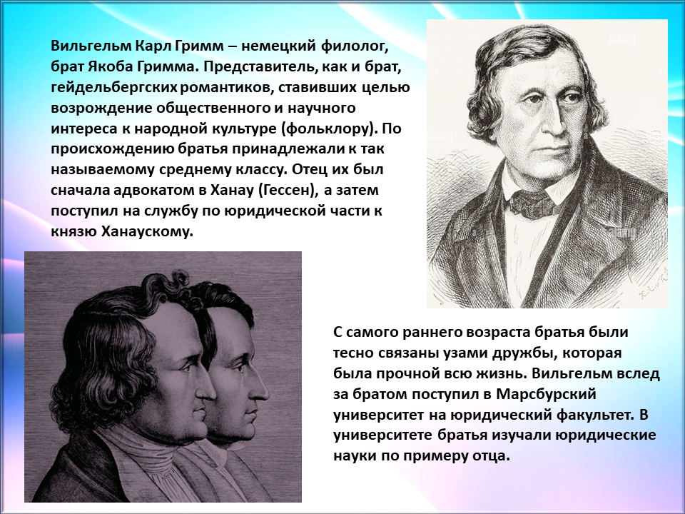 Нет такого человека, который не любил бы сказки, особенно волшебные. Все они интересные, захватывающие и поучительные. Сказки будят и развивают воображение, учат думать, чувствовать, сопереживать. Без них наша жизнь была бы намного скучнее. Именно такие сказки писали два замечательных человека – это братья Якоб и Вильгельм Гримм. И в этих сказках всегда найдется то, что можно и нужно обсудить со своими детьми. Братья Якоб и Вильгельм Гримм родились в немецком городе Ханау. С детства они были дружны и очень любили сказки. Когда братья выросли, они стали юристами. Но ещё в студенческие годы они увлеклись собиранием и изучением старинных немецких легенд и народных сказок. Славу великих сказочников принесли им три сборника «Детских и семейных сказок». Среди них «Бременские музыканты», «Горшок каши», «Белоснежка», «Золотой гусь», «Госпожа Метелица» — всего около 200 сказок были переведены на большинство известных языков и стали любимыми как для детей, так и для взрослых. Многие сказки братьев Гримм стали мультфильмами и художественными фильмами.