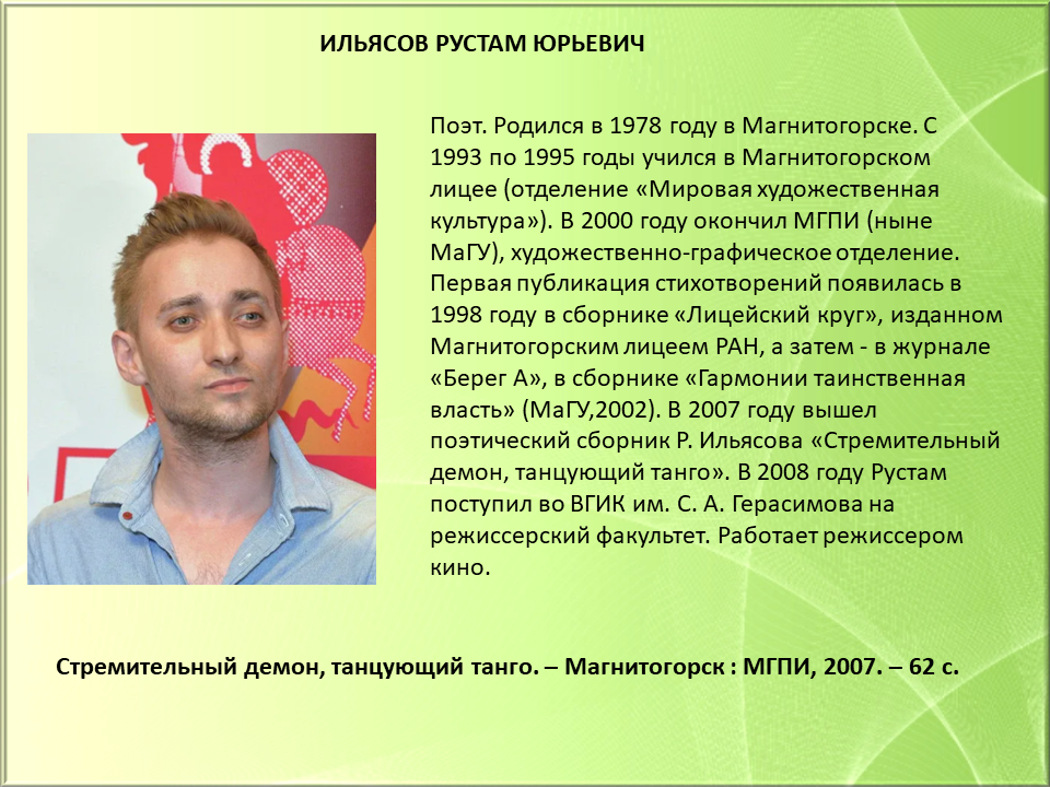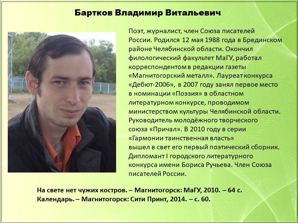 Но и сама Магнитка вырастила плеяду замечательных поэтов. Поэты «рождались» не случайно: героическое время, героический труд, романтика. Жили нелегко, в бараках и палатках, но литературная жизнь била ключом. Магнитка — это начало пути многих поэтов и писателей. В своих стихах они не могли не писать о труде на Магнитке, не могли не увидеть уникальности края с его красотой и богатством природы, особого характера людей разных национальностей.