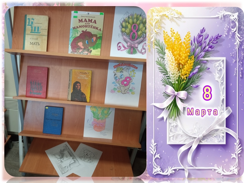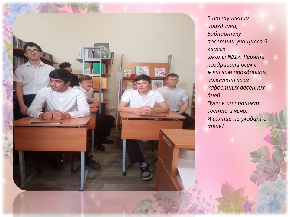 Ребятам очень понравилась наша выставка ко дню 8 марта, особенно книга М. Горького «Мать». Учащиеся 9 класса поздравили всех с наступающим Женским днем, пожелали: