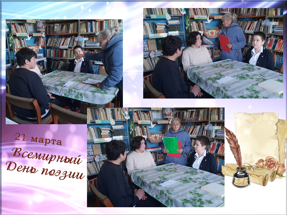 Библиотекарь рассказала присутствующим, об истории празднования, о том, что поэзия — это величайшее из искусств, созданных человеком. Читатели узнавали по строкам авторов известных стихотворений, не только слушали, но и сами с удовольствием читали любимые строки известных поэтов: А.С. Пушкина, М.Ю. Лермонтова, С. Есенина, Ф. Тютчева и др. В ходе мероприятия участники узнали, на сколько, поэзия удивительна и как она заставляет по-новому смотреть на мир, дает возможность выразить чувства, которые накопились в сердце.
