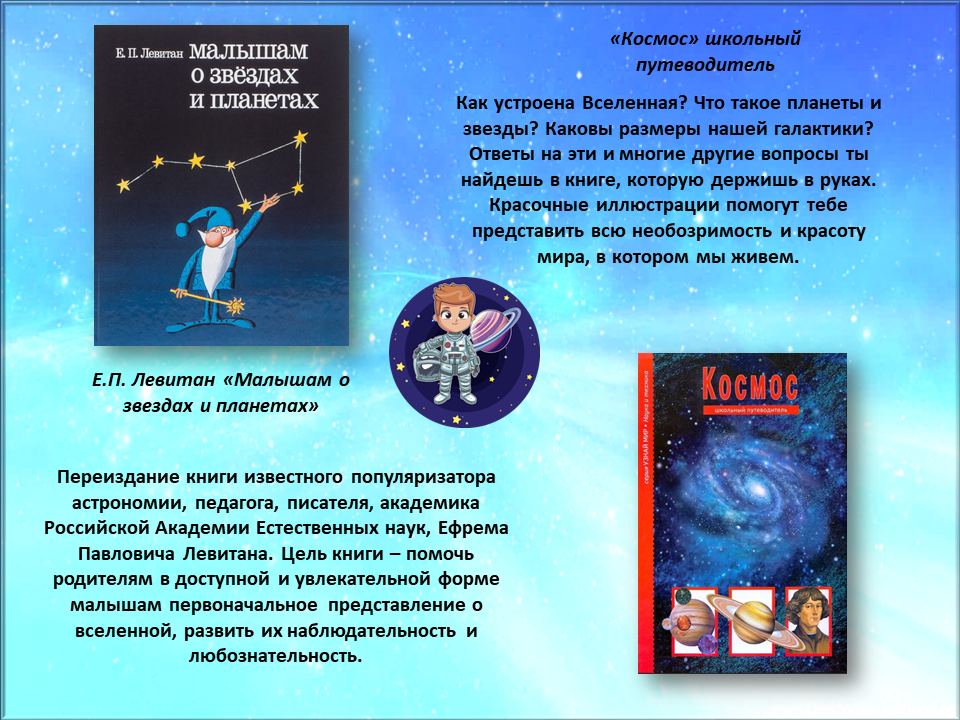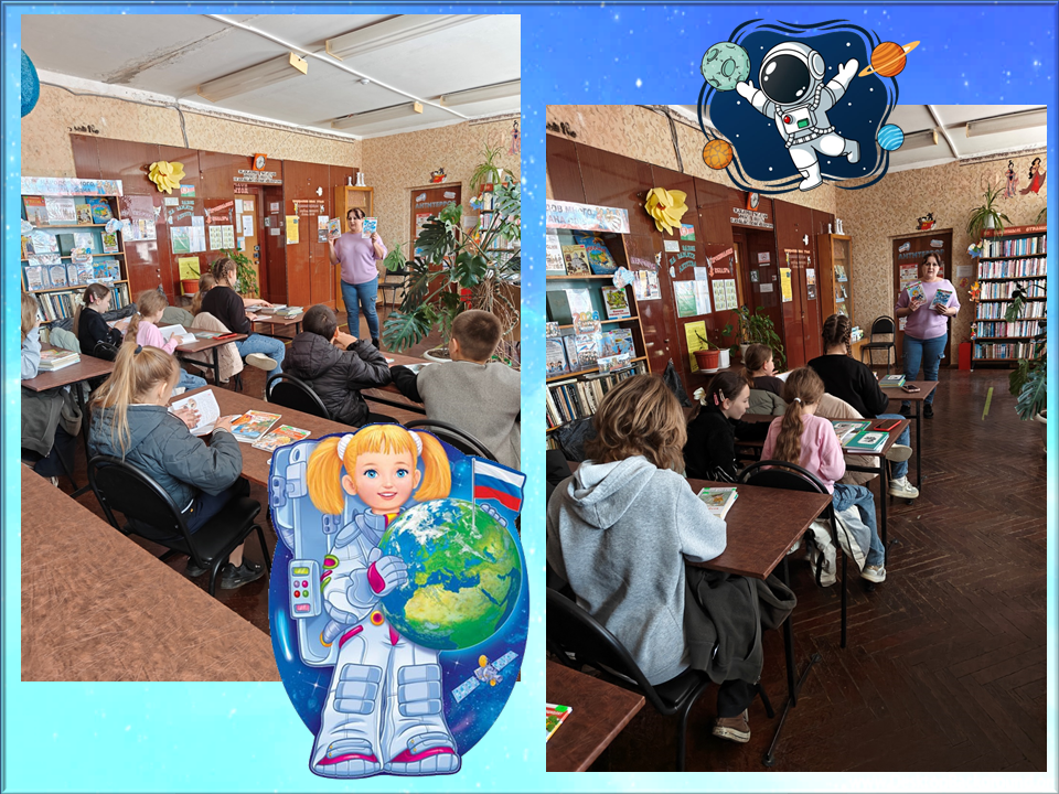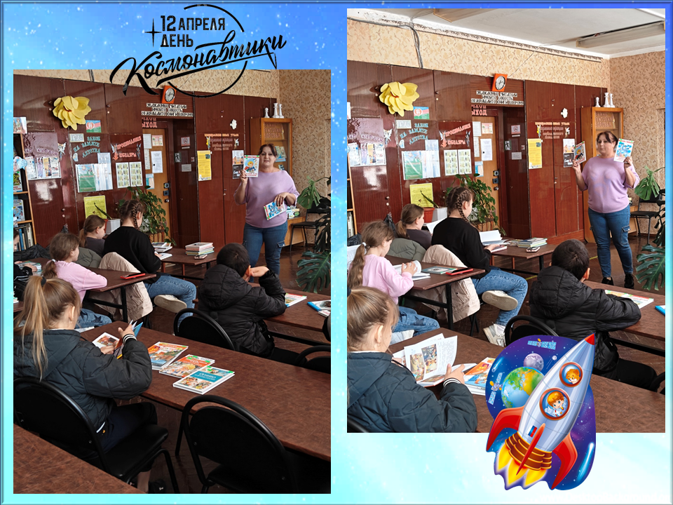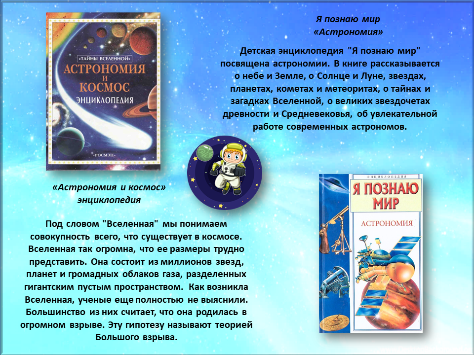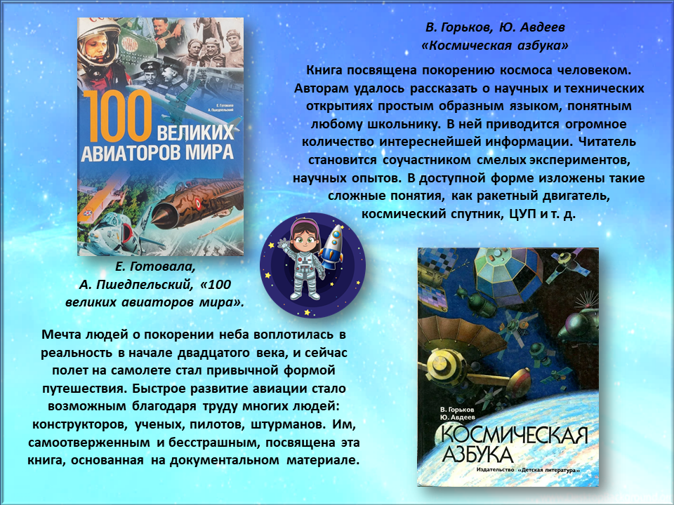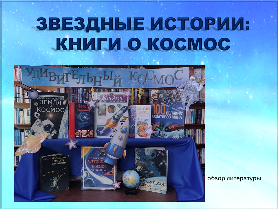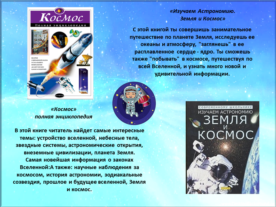 На книжной выставке была представлена энциклопедическая литература, которая рассказывает о покорении космоса; о великих авиаторах и космонавтах; о планетах, звездах и космосе.