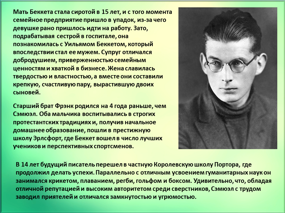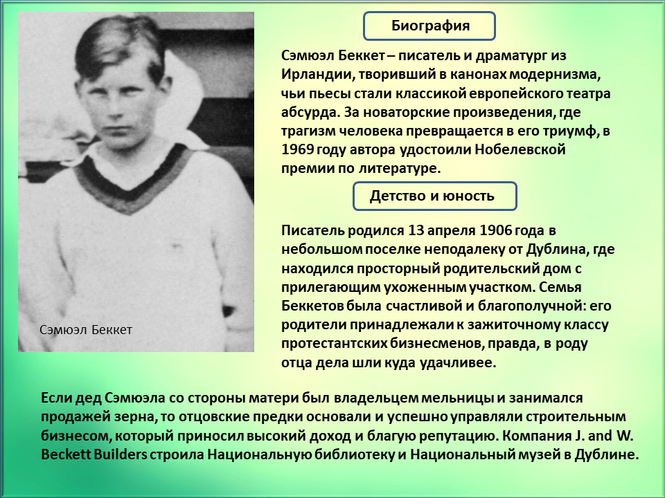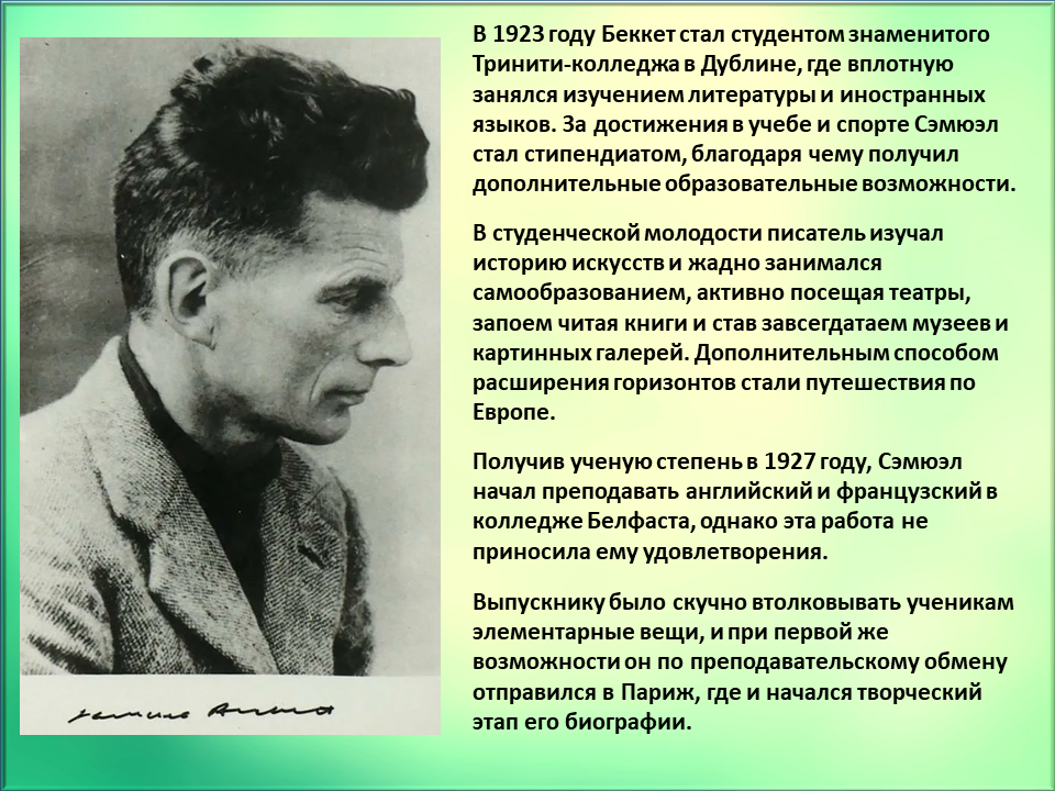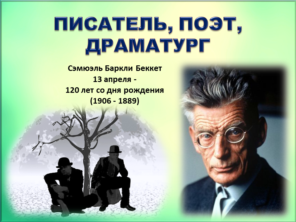 13 апреля – 120 лет со дня рождения ирландского писателя, поэта и драматурга, лауреата Нобелевской премии (1969) Сэмюэля Баркли Беккета (1906–1989).
