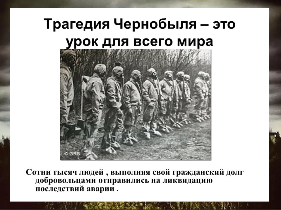 Первыми удар приняли пожарные и персонал станции. Всего в ликвидации последствий с 1986 по 1990 год приняли участие более 600 тысяч человек со всего Советского Союза. Они выполняли невероятно опасные задачи: сбрасывали обломки с крыши реактора (работая всего по 30 секунд из-за высокой радиации), проводили дезактивацию территории и возводили защитный саркофаг.