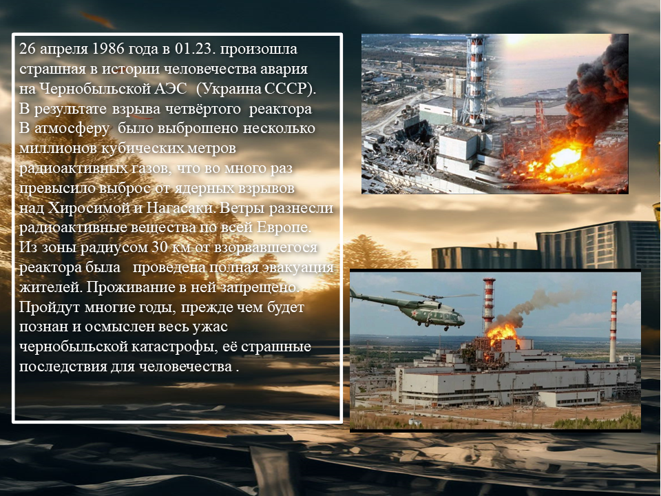 26 апреля 1986 года в 01.23 произошла страшная по масштабам и последствиям чернобыльская катастрофа, изменившая судьбы людей. Чёрный день Чернобыльской трагедии продолжает и сегодня волновать людей. Этот день не прошёл бесследно, он будет всегда объединять людей одним воспоминанием.