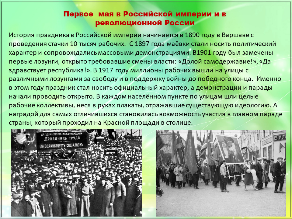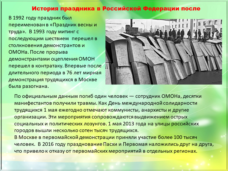 Официально Праздник Весны и Труда в нашей стране был учрежден больше 30 лет назад (постановление Верховного Совета РФ N 2706-1 от 21 апреля 1992 года). По одной из версий, его название было заимствовано из популярного произведения поэта и революционера Феликса Волховского — «Первое мая (Марш)» (1907). В стихотворении встречаются фразы: «Первое мая! Первое мая! Праздник труда и весны!» и «Первое мая! Первое мая! Праздник весны и труда!»