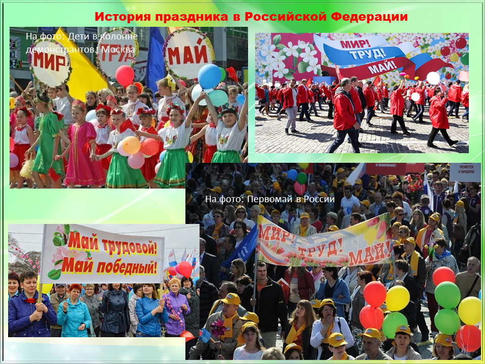 В некоторых населенных пунктах России до сих пор сохранились традиции первомайских шествий (как правило, на них выходят работники социальных учреждений и градообразующих предприятий, активны профсоюзы) и праздничных концертов.