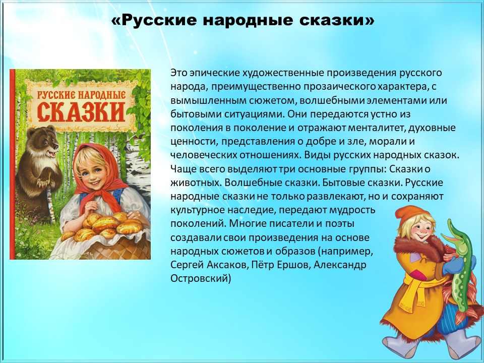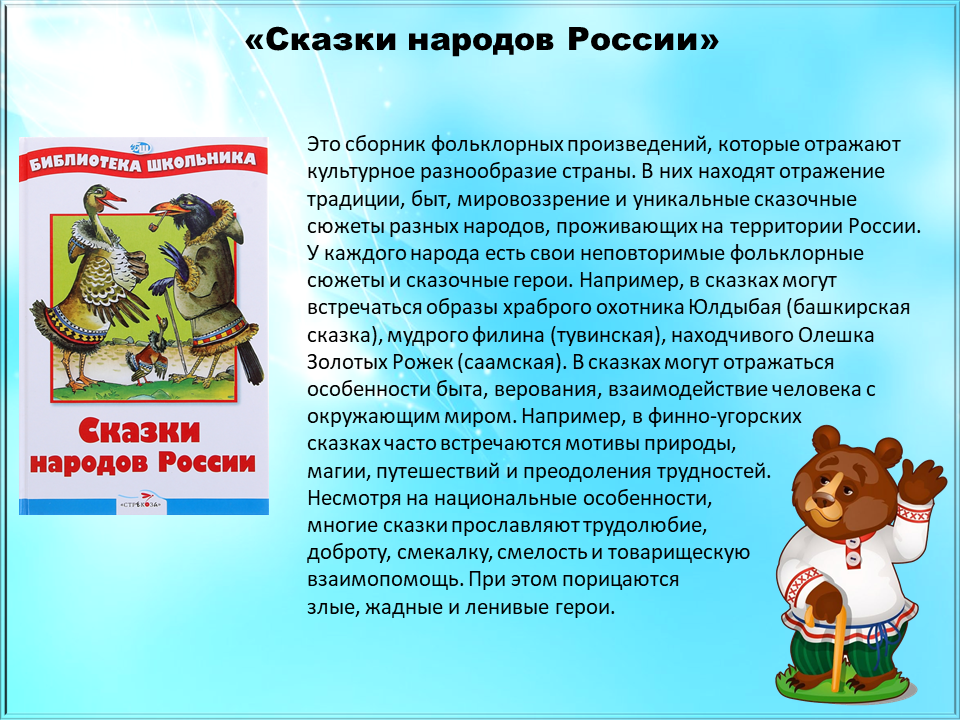 Сказки народов России часто объединяют темы дружбы, взаимопомощи, смелости, трудолюбия и нравственных ценностей. Они помогают познакомиться с культурой, историей и мировоззрением разных народов.